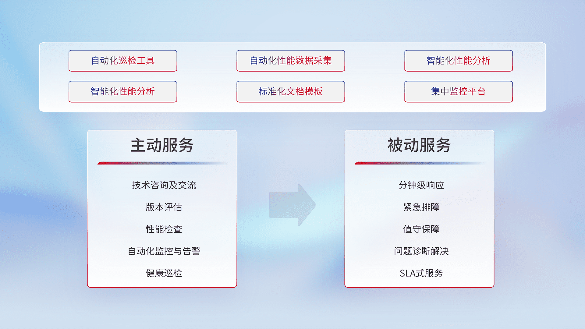 智能化工具和标准化文档,,,,保障服务质量,,提供主动服务(包含技术咨询、、、版本评估、、、、性能检查、、自动化监控与告警、、、健康巡检)和被动服务包含(分钟级响应、、、紧急排障、、、、值守保障、、问题诊断解决、、、SLA服务)。。