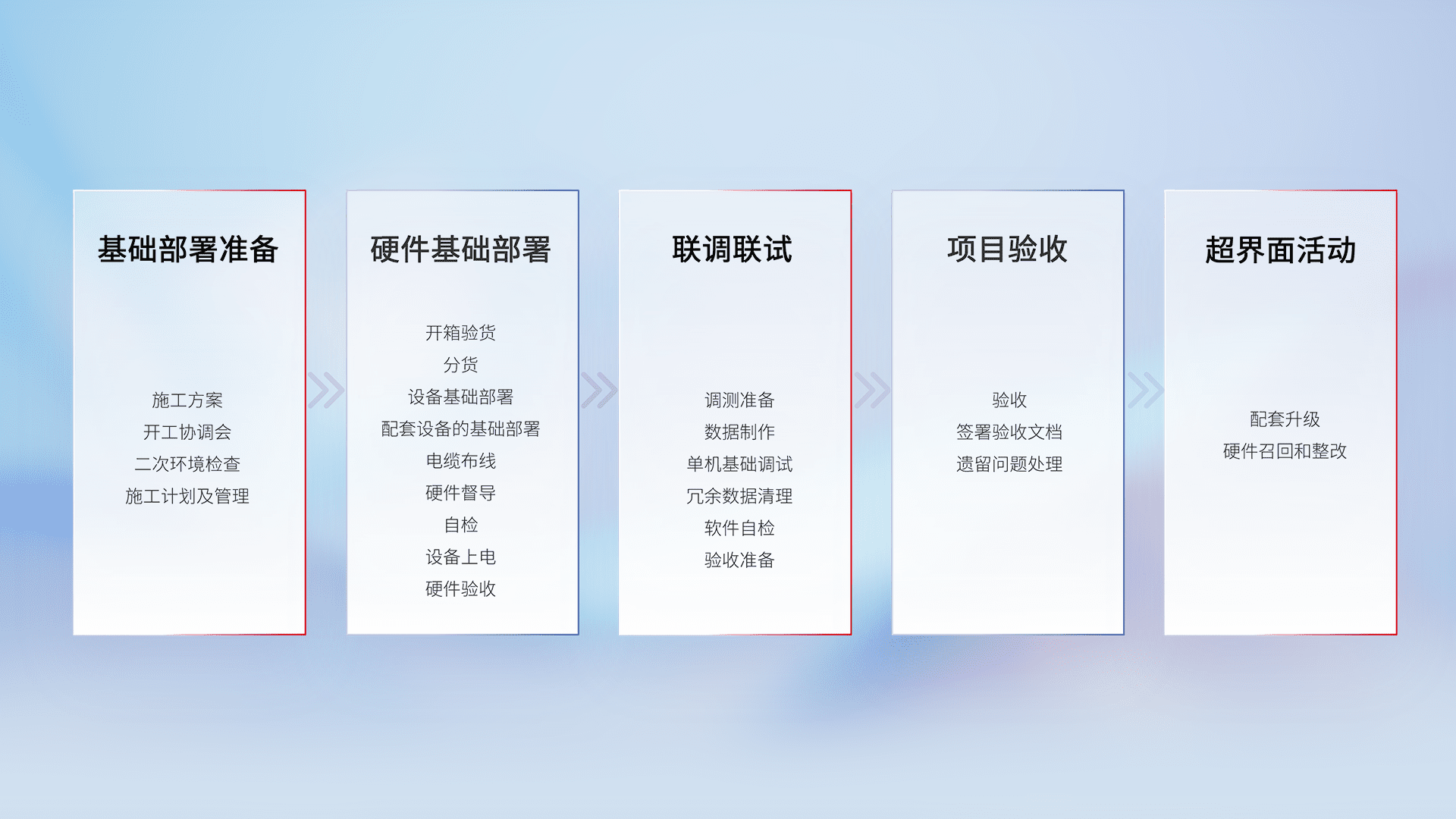 从基础部署准备、、、硬件基础部署、、联调联试、、、项目验收、、、、越界面活动的全过程可追溯,,保证施工质量和进度。。。。